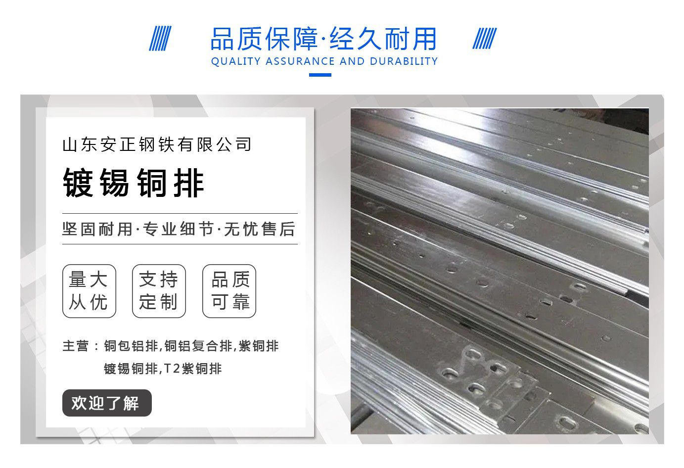 About us山東安正鋼鐵有限公司是集機電設備設計、開發、生產制造為一體的綜合性企業,是國內制造銅包鋁/鋼、銅包鋁排設備最早、最大的生產基地,公司有一批專業從事機械設計開發的精英人才,完善的質量保障體系,一流的員工和決策人員,從而保證公司迅猛發展。 公司充分利用軍工企業的技術優勢和全部配套進口的加工設備和檢測設備,不斷地開發適應市場需要的YHJ型復合金屬導線包覆生產線,現已實現了整條生產線的配套化、系列化:Φ20、Φ25、Φ40、Φ72機組,其中YHJ20和YHJ25及YHJ40型機組主機部分綜合性能已達到了國際當代先進水平。另外公司還配套生產生產線輔助機械設備、環鍛機、刷子機、拉絲機、收線機等,可根據用戶要求設計、制造、生產各種規格的銅包鋁排,銅鋁復合排,紫銅排,鍍錫銅排,T2紫銅排等產品,并可提供相關的技術服務和人員培訓。 近來,公司正在熱銷應用在開關柜及母線槽和箱式變壓器等廣泛領域的銅包鋁排產品及銅包鋁排設備,并據此申請了與銅包鋁排設備相關的多項專利。現在公司將繼續應用高端技術產權來帶動和引導雙金屬產業走向更遠,從而達到節能環保的目的并推動經濟的快速發展。 總之,我們將努力按照市場要求去做,并將以一流的技術、一流的產品,一流的服務奉獻于用戶、造福于社會、 與社會同行業者們一道攜手創大業,共同...